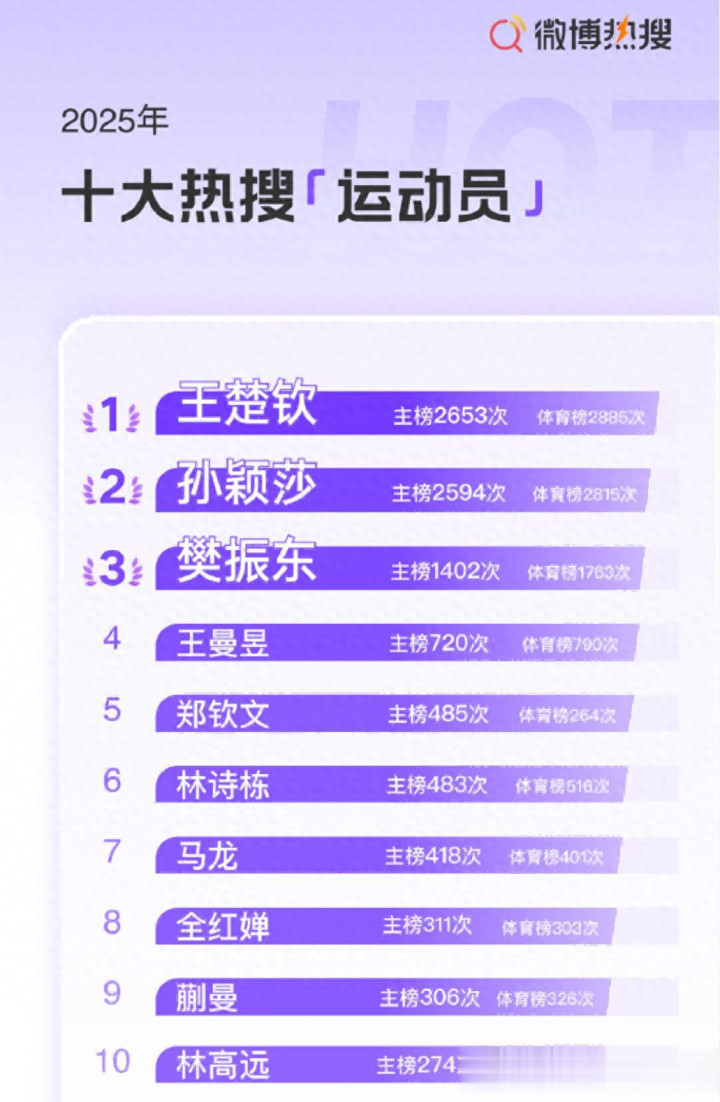根据微博官方发布的《2025热搜趋势报告》,乒乓球依然是体育类热搜的主力,全年热搜量突破1万次,国乒选手占据前十名中的八席,王楚钦的热搜次数高于其他乒乓球选手,远超孙颖莎和樊振东。